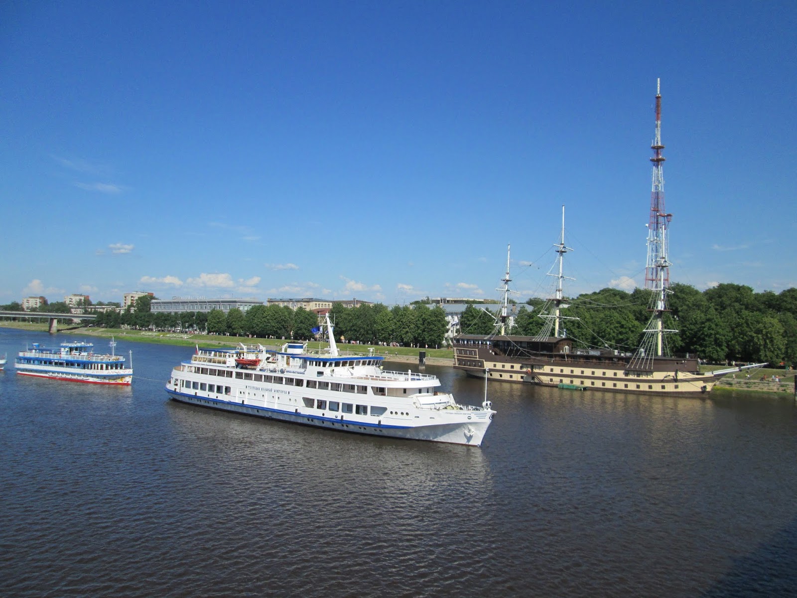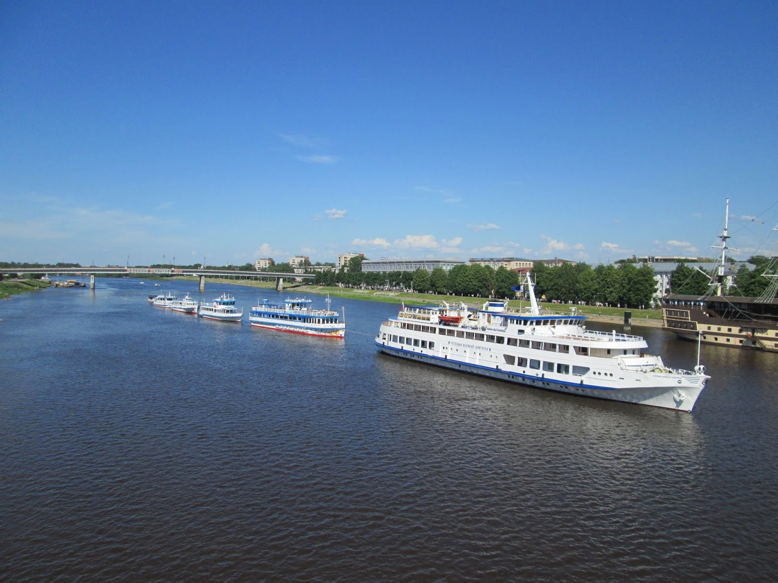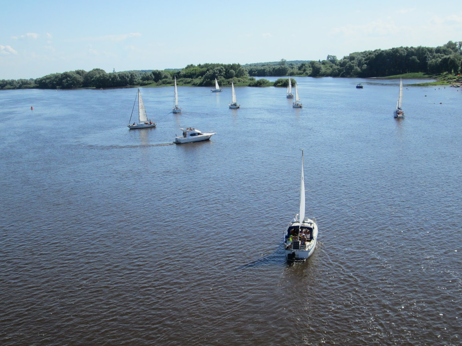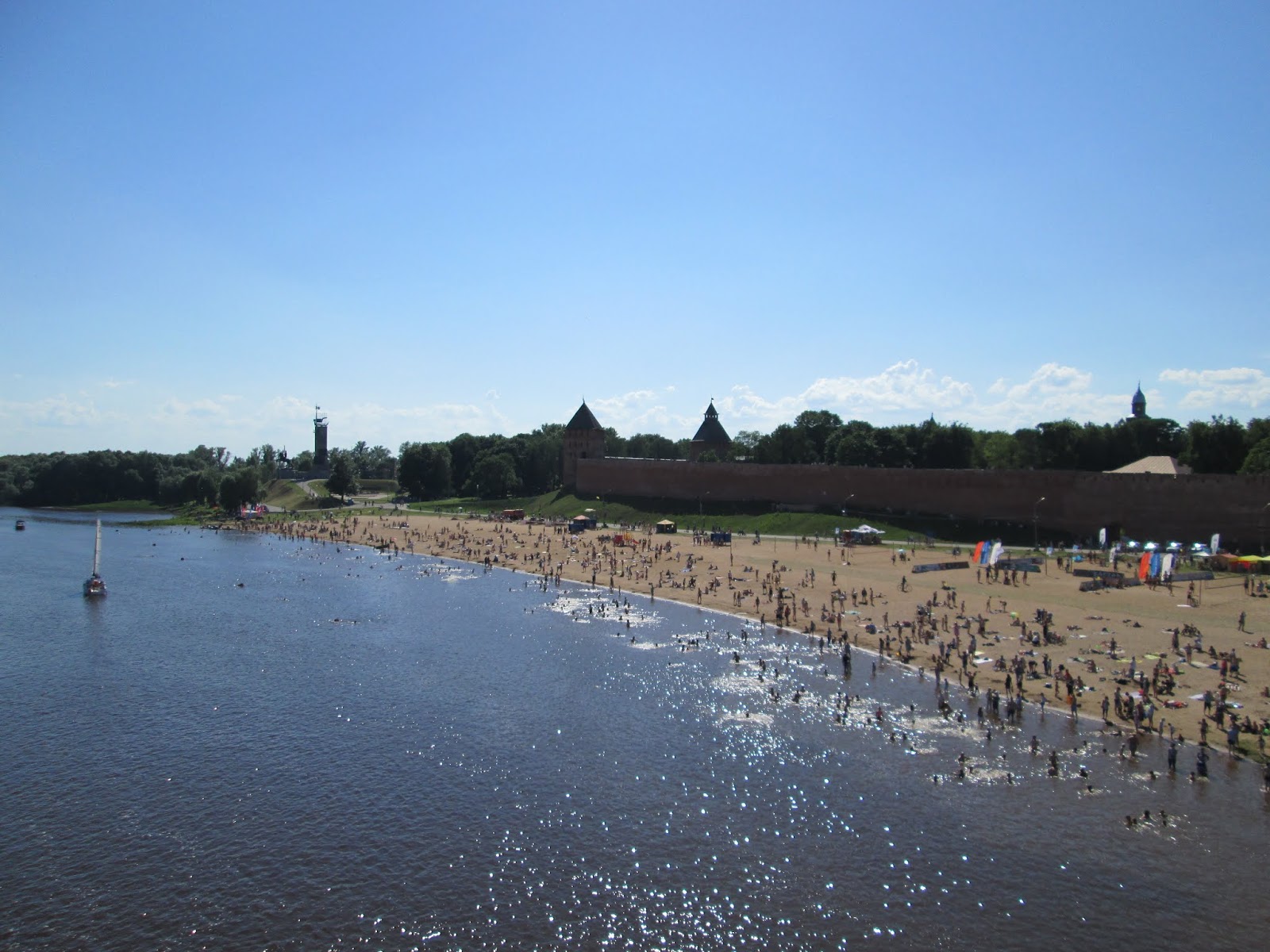В расписании мероприятий в 15:00 - 17:00 значился парад судов. Полдень, жаркое лето и искрящаяся в лучах солнца вода. На пляже – много купающихся и загорающих людей. К северу от пешеходного моста выстроилась цепочка судов. Самый первый и самый крупный корабль – теплоход «Господин Великий Новгород». Его длина составляет 65,2 метра, а ширина – 12 метров. К югу от пешеходного моста – парусники.